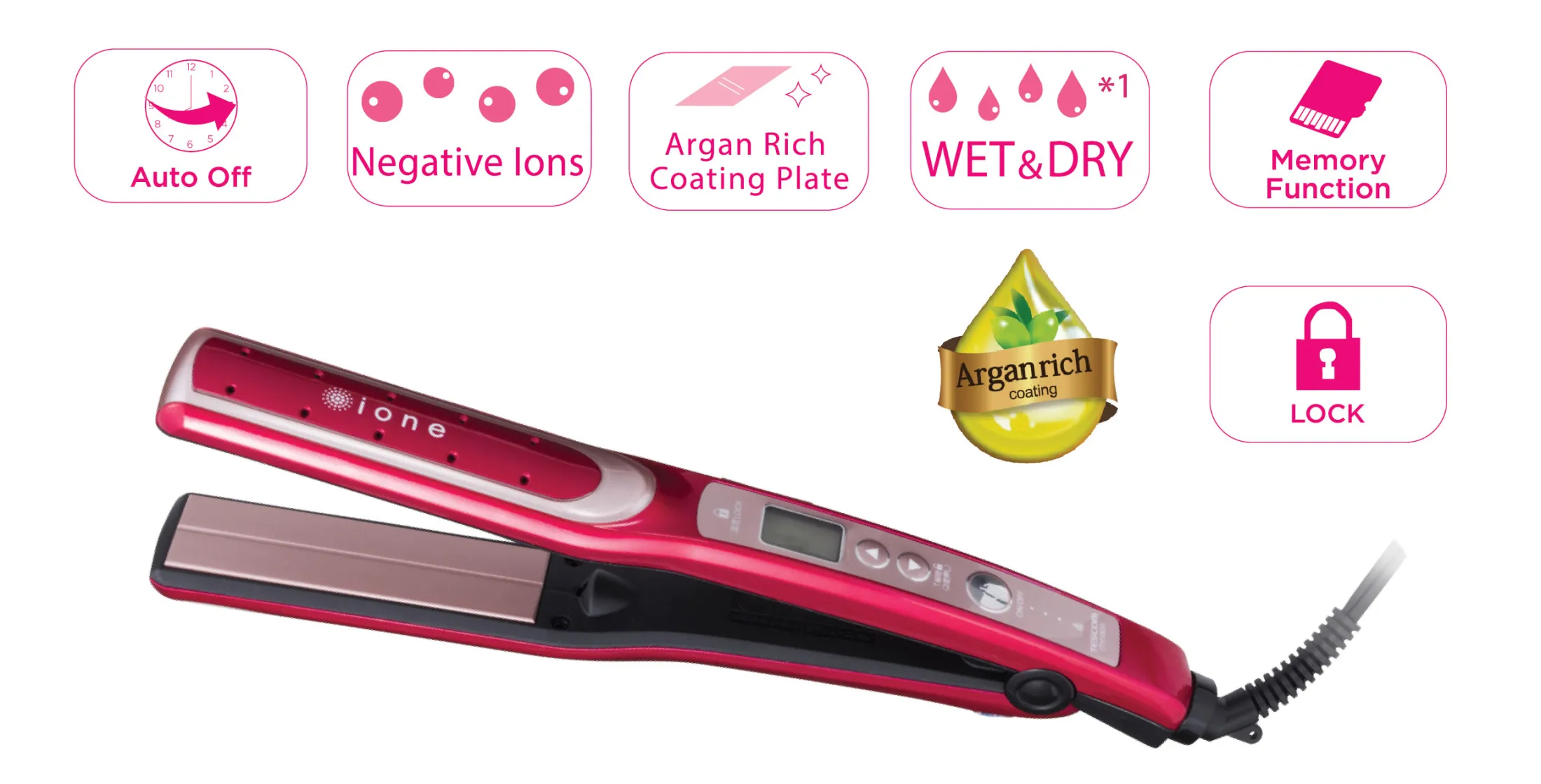 • Catokan terbaru Tescom yang dilengkapi dengan Ion Negatif dan Argan Rich Coating dimana plat ini sangat baik untuk memperhalus hasil styling dan tidak membuat rambut rusak. Dapat digunakan dalam keadaan rambut kering ataupun basah. Beberapa fitur unggulan yang dimiliki Tescom NTIR 1805 – Negative Ion Hair Iron : • Moving Plate : Plat yang dapat bergerak mengikuti arah rambut pada saat distyling agar rambut tidak tersangkut. • Argan Rich Coating : Selain ion negatif plat catokan ini dilengkapi juga dengan argan oil untuk melindungi rambut dari kerusakan dan membuat hasil yang lebih halus. • Wet & Dry Function : Memiliki 10 lubang yang ada di atas plat yang berfungsi untuk mengeluarkan uap sehingga dapat digunakan pada rambut basah. • Pengaturan Suhu : Terdapat tampilan digital untuk pengaturan suhu dari 90o – 190o C • Memory Function : Memiliki fungsi yang dapat mengingat suhu favorit anda/ suhu yang terakhir dipakai, sehingga anda tidak perlu mengatur ulang suhu di setiap pemakaian. • Quick Heat & Temperature Lock : Dengan adanya pemanas/ heater pada dua sisi plat membuat alat ini lebih cepat mencapai suhu maksimum yang diinginkan. Suhu akan terkunci dengan otomatis untuk mencegah pergantian suhu yang tidak disengaja. Untuk meng-unlock dapat dilakukan dengan cara memencet tombol ▼dua kali. • Auto Off : Alat dapat mati secara otomatis setelah 30 menit tidak digunakan.Produk ini sudah tersertifikasi oleh K3L (Keamanan, Keselamatan, Kesehatan dan Lingkungan Hidup) dan IMKG (Izin Manual Kartu Garansi).